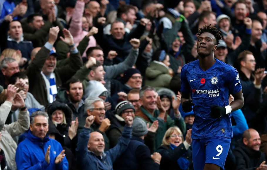 Chelsea’s English striker Tammy Abraham celebrates after he scores his team’s first goal during the English Premier League football match between Chelsea and Crystal Palace at Stamford Bridge in London on November 9, 2019. (Photo by Adrian DENNIS / AFP) / RESTRICTED TO EDITORIAL USE. No use with unauthorized audio, video, data, fixture lists, club/league logos or ‘live’ services. Online in-match use limited to 120 images. An additional 40 images may be used in extra time. No video emulation. Social media in-match use limited to 120 images. An additional 40 images may be used in extra time. No use in betting publications, games or single club/league/player publications. /